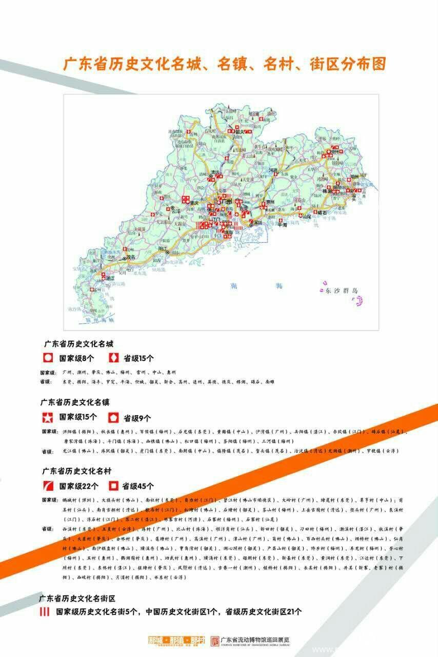 广东位于岭南文化的中心地、海上丝绸之路的发祥地、中国近现代民主革命策源地,又是华侨之乡,保存的文化遗产颇为丰厚。目前,我省共有国家级历史文化名城8个,省级历史文化名城15个;国家级历史文化名镇15个,省级历史文化名镇9个;国家级历史文化名村22个,省级历史文化名村45个;国家级历史文化名街5个,中国历史文化街区1个,省级历史文化街区21个,国家级传统村落125个,省级传统村落186个。