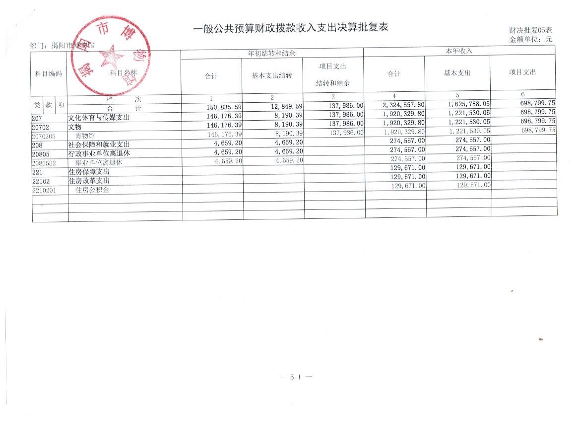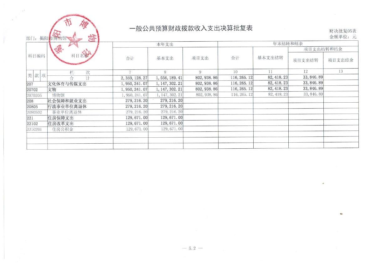 五、 一般公共预算财政拨款支出收入支出决算批复一