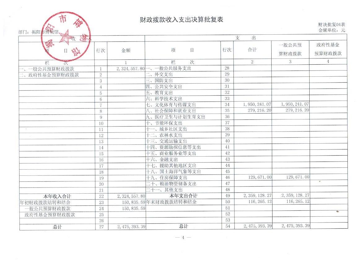 四、 财政拨款支出收入支出决算批复表