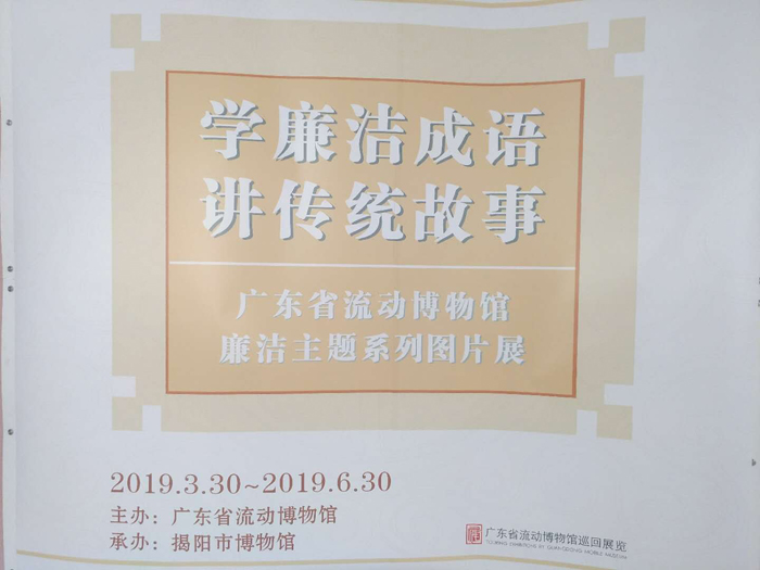 由广东省流动博物馆主办,揭阳市博物馆承办的“学廉洁成语,讲传统文化”廉洁主题系列图片展于2019年3月30-6月30日在我馆举办。