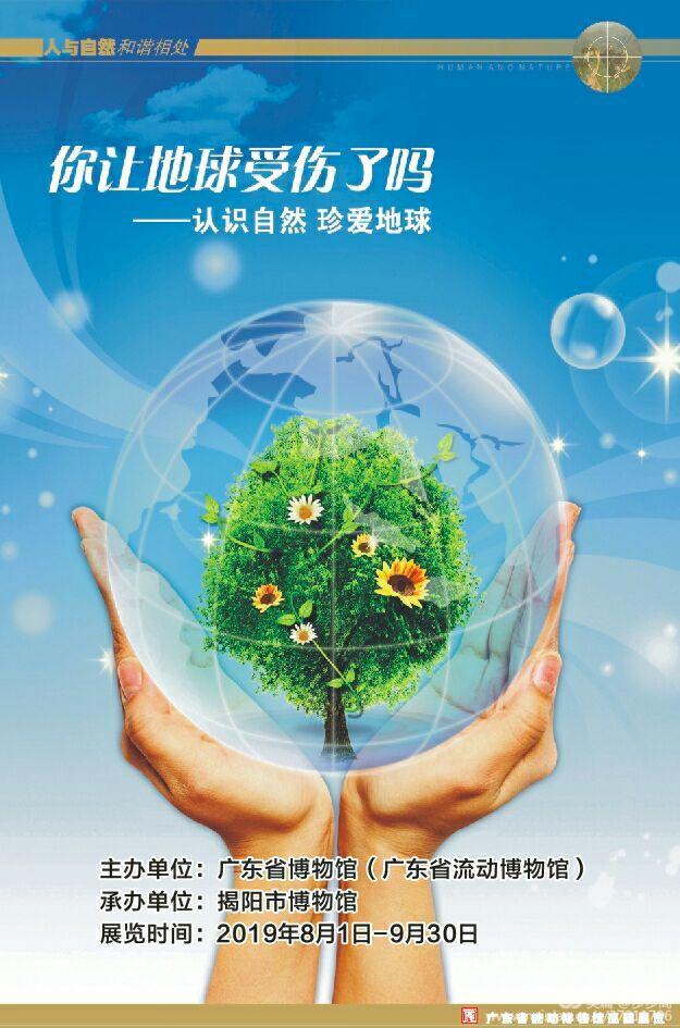 为了提高人们保护地球,珍惜资源的意识,全面推动环境建设和生态文明建设。揭阳市博物馆从8月1日起举办《你让地球受伤了吗--认识自然,珍爱地球》科普图片展览。本次展览由广东省流动博物馆主办,揭阳市博物馆承办,展览图片从空气、噪声、光、电磁、水、土壤污染、土壤荒漠化、野生生物物种消失等方面诠释人与自然之间休戚与共、生死相伴的关系。 通过这个展览,让人们清楚地认识到,人类只有一个地球,地球和我们息息相关。我们应该更加全面认识地球,保护地球,共同创造更美好未来。