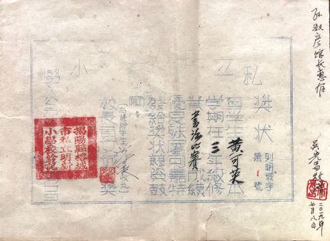 私立明新小学,后改为榕西小学,也是西门小学的前身。这里培养了一批又一批的学生。这张承载着珍贵记忆的奖状,在今天也成为联系几代人的纽带。孙淑彦先生说:“黄文城校长为吾邑已故画家,我与之有一面之雅,其公子至今仍有往来,读此奖状更觉亲切。”遗憾的是,奖状中的获奖者黄可英女士(或先生),按推算,今年约八十岁左右,未知今在何处?
