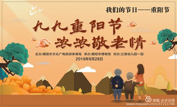 为庆祝“中华人民共和国成立70周年”,也为了培养孩子们从小尊老敬老,营造爱老、敬老、助老的社会氛围,揭阳市博物馆将在9月28日上午的重阳节前夕,在揭阳楼二楼大厅举办“九九重阳节,浓浓敬老情”的活动。本次活动由揭阳市文化广电旅游体育局主办,揭阳市博物馆承办,立德幼儿园一园协办。届时将有立德一园的小朋友及爷爷奶奶前来参加,现场了解重阳节的来历、风俗和意义;制作重阳节礼物送给爷爷等亲子活动。希望通过我们精心策划举办这个有意义的公益活动,将传统美德传承发扬