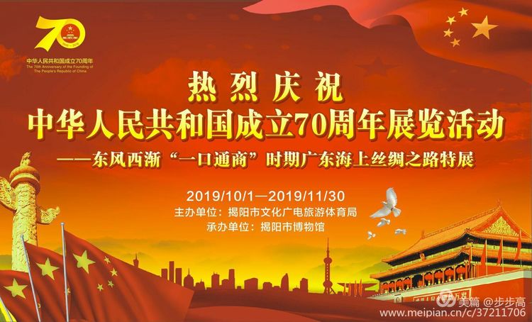 为庆祝“中华人民共和国成立70周年”,响应国家将文博事业与“一带一路”倡议相结合的重要实践,讲好海丝故事、宣传海丝文化、传递丝路精神的重要举措。揭阳市博物馆举办了《东风西渐——“一口通商”时期广东海上丝绸之路特展》图片展览 ,展览的内容,见证了曾经海丝路上中西文化的交流,也正在见证着“21世纪海上丝绸之路”的新发展。《东风西渐——“一口通商”时期广东海上丝绸之路特展》带着一张张珍贵的照片、一段段解说历史的文字,向我们展示广东海上丝绸之路的独特魅力,诉说遥远而辉煌的外交历史。
