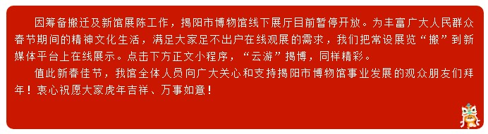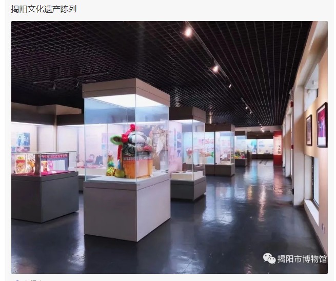 《揭阳文化遗产陈列》共分二大部分,分别展出我市代表性强、文化价值高的国家级、省级、市级和县级“非遗”及重点文物,全面展示揭阳的乡土人情、生活习俗、技艺特点、建筑风格和文化形态。举办这个陈列,对于增强海内外揭籍乡亲的家乡情感、增进揭阳全市的团结、统一和稳定,对于传承揭阳优秀历史文化,具有十分重要的意义。