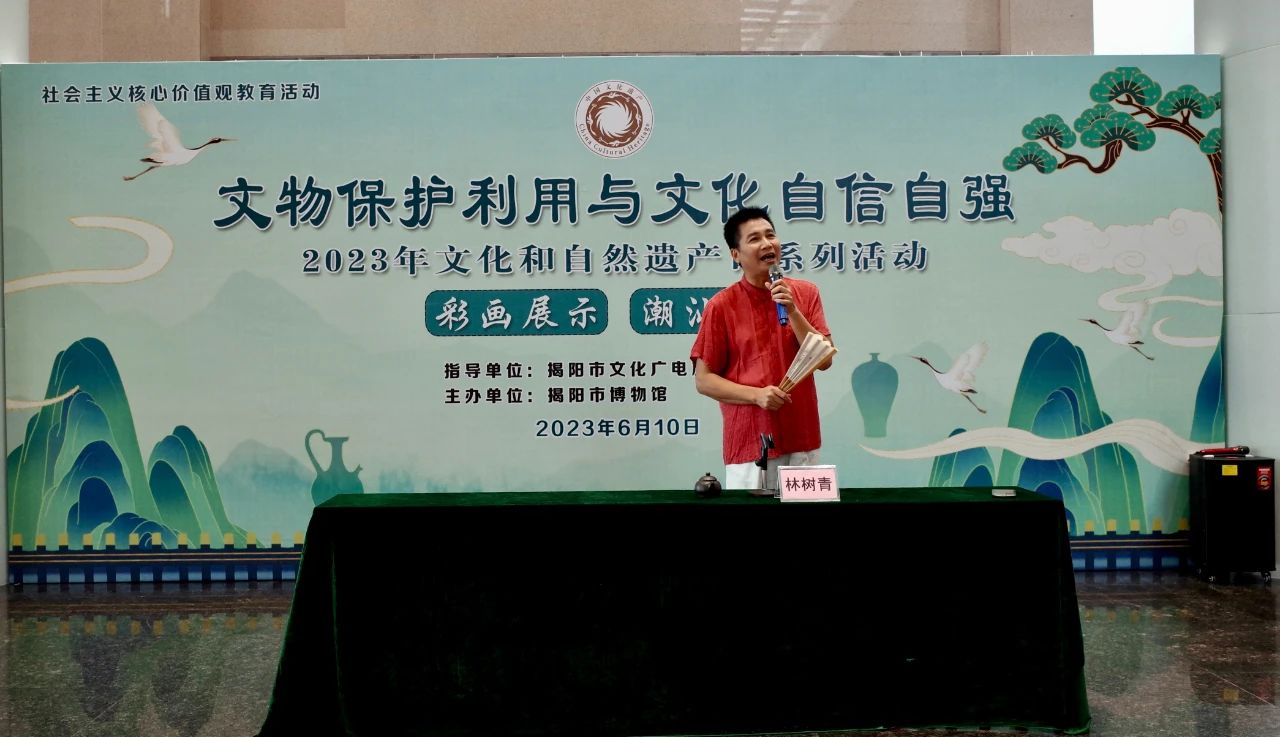 10日下午,省级非物质文化遗产项目《潮汕讲古》传承人林树青老师在我馆一楼大厅向观众分享了先贤黄奇遇、革命先驱许玉磬的故事。生动的语言,丰富的内容,再结合潮汕方言俗语进行押韵,林树青老师手摇折扇,妙语连珠,声情并茂的讲述让台下观众听得津津有味、笑声不断,掌声不绝,展现了揭阳传统文化和潮语讲古的魅力。