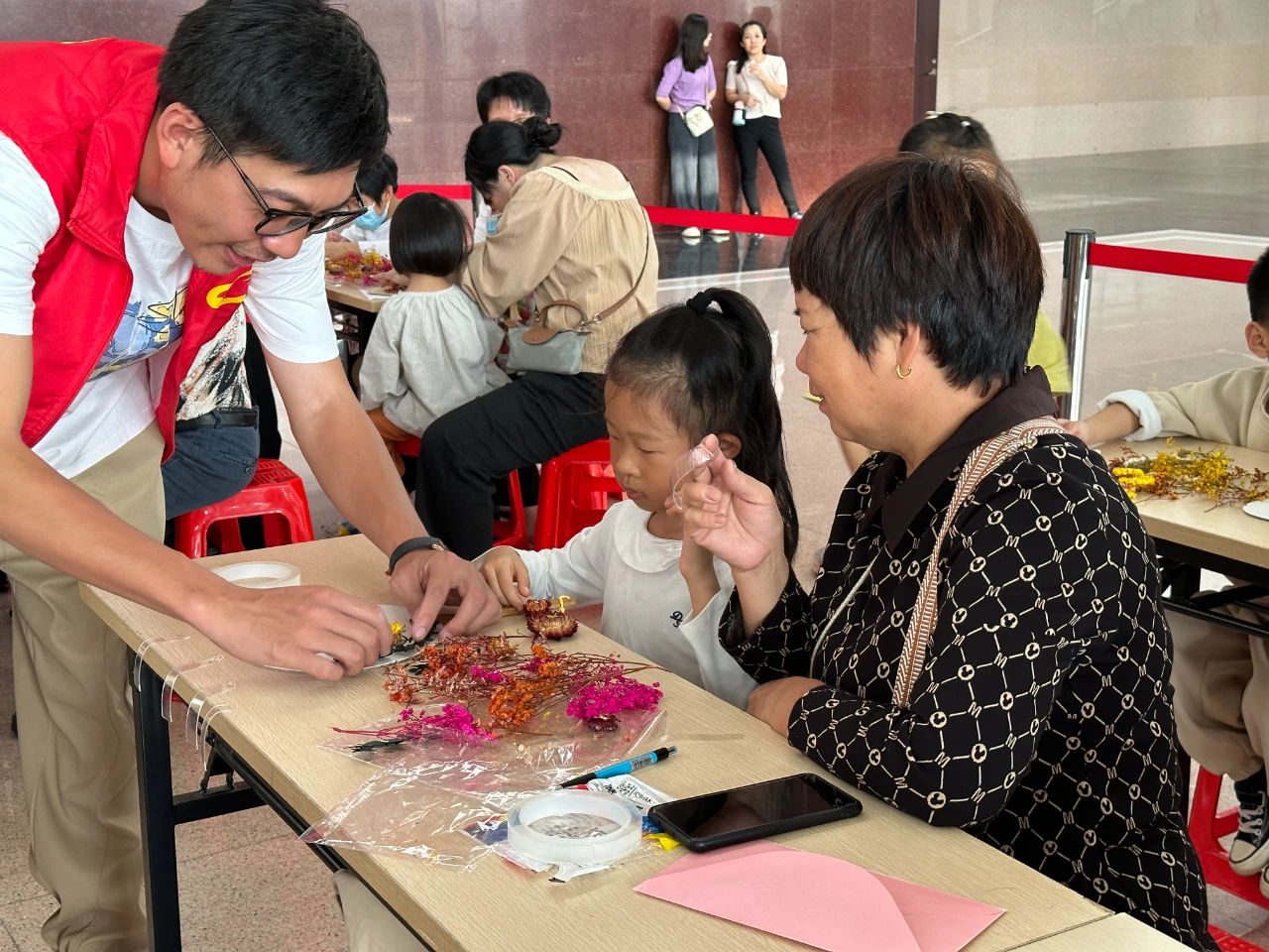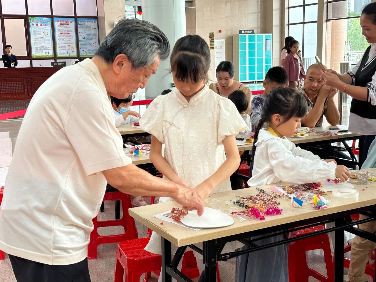 22日下午,揭博一楼大堂热闹非凡,几十名小朋友和爷爷奶奶一起参加重阳节社教活动。工作人员先向大家介绍了重阳节的由来、习俗,以及它所蕴含的美好寓意,让大家能更加详细、深入地了解重阳节这个传统节日。在讲解过程中,小朋友们听得格外认真。随后,大家在工作人员的指导下开展重阳节菊花主题团扇制作,一把实木团扇,一包干花材料,指尖拈起朵朵花瓣,于一粘一帖的沉浸式DIY体验中,领略团扇文化之风采。