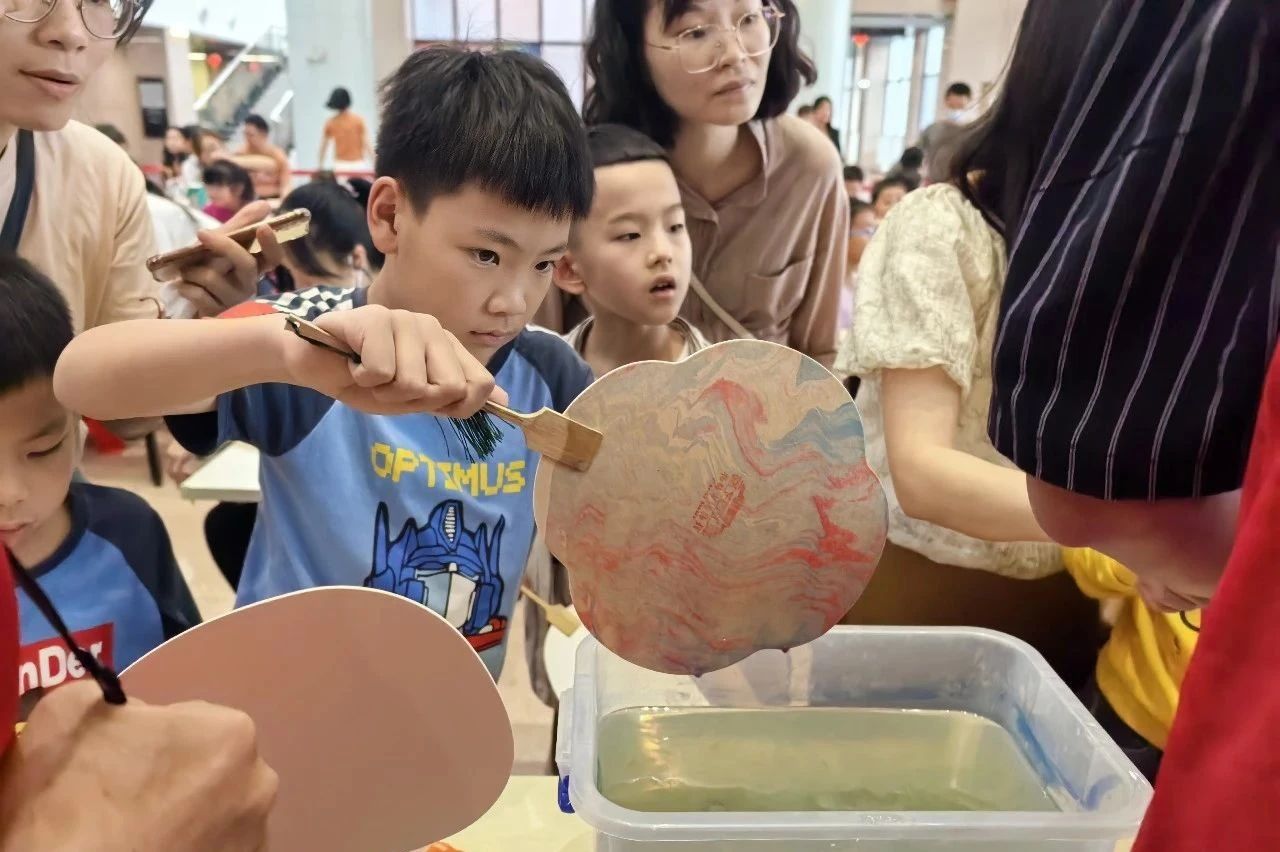 随后,工作人员带领孩子们进行漆扇体验活动。首先为孩子们讲解漆扇是什么,具有什么样的特点,从漆到器,从技到艺,在中国传统文化中又体现出怎样的价值。活动开始后,老师进行了简单的讲解、示范,同学们很快就掌握了基本方法,戴好手套跃跃欲试。一把把白色的扇子,浸入漂漆中,像被施加了魔法一样。孩子们充分发挥自己的想象力和创造力,制作出了一件件精美的作品,切身感受了一场色彩流动的美学,在心中种下了非遗传承的种子,树立文化自信,赓续中华文脉。