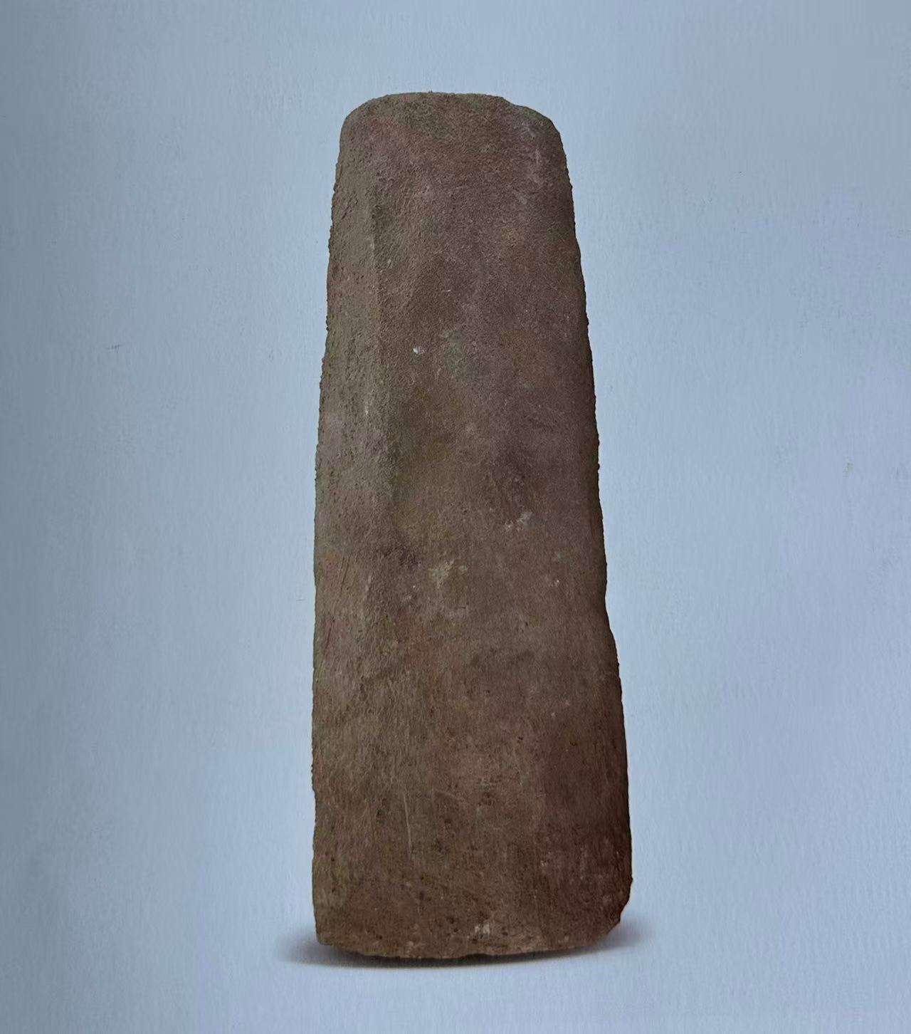 揭东区新亨新岭矿场出土。砂板岩石质。顶部微弧,长身梯形,两侧略向外斜,弧刃。横截面呈梯形。通体磨制。器形较大,磨制精工。