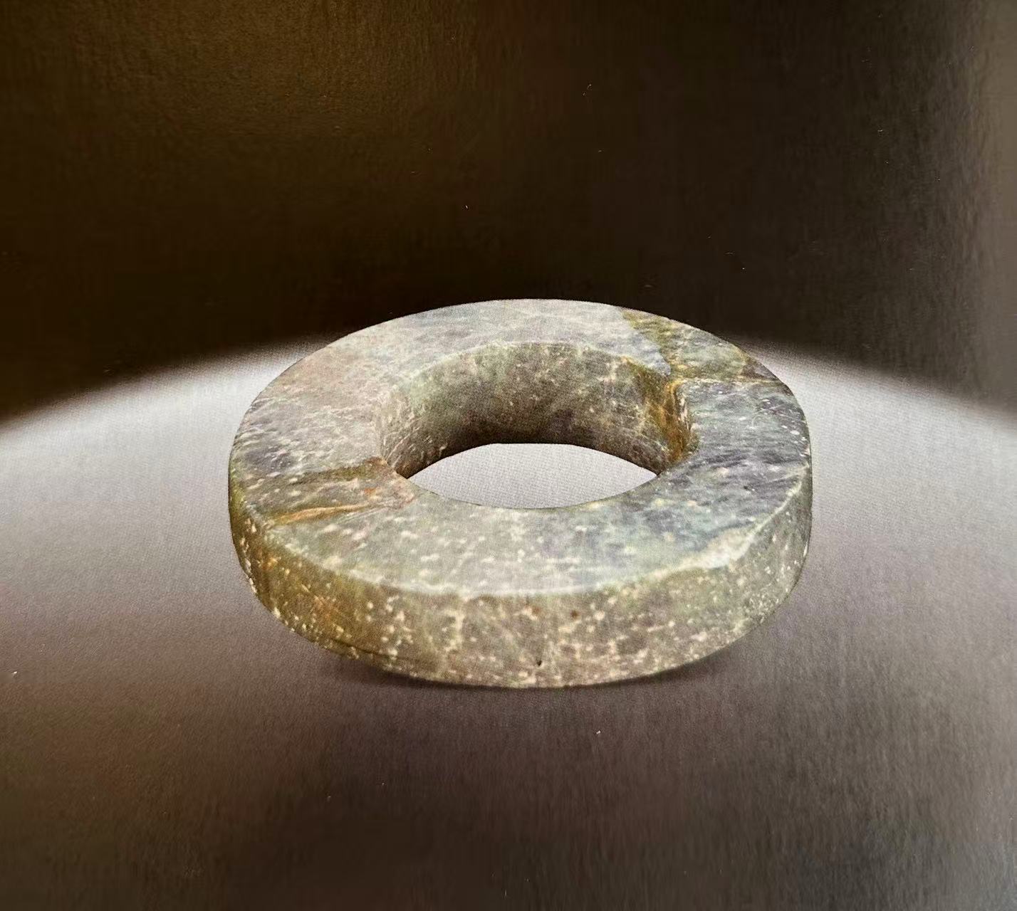 揭东区新亨硕和秦可坑山出土。滑石制作。青灰色,横截面呈长方形。通体磨制。是同类器中之佳品。