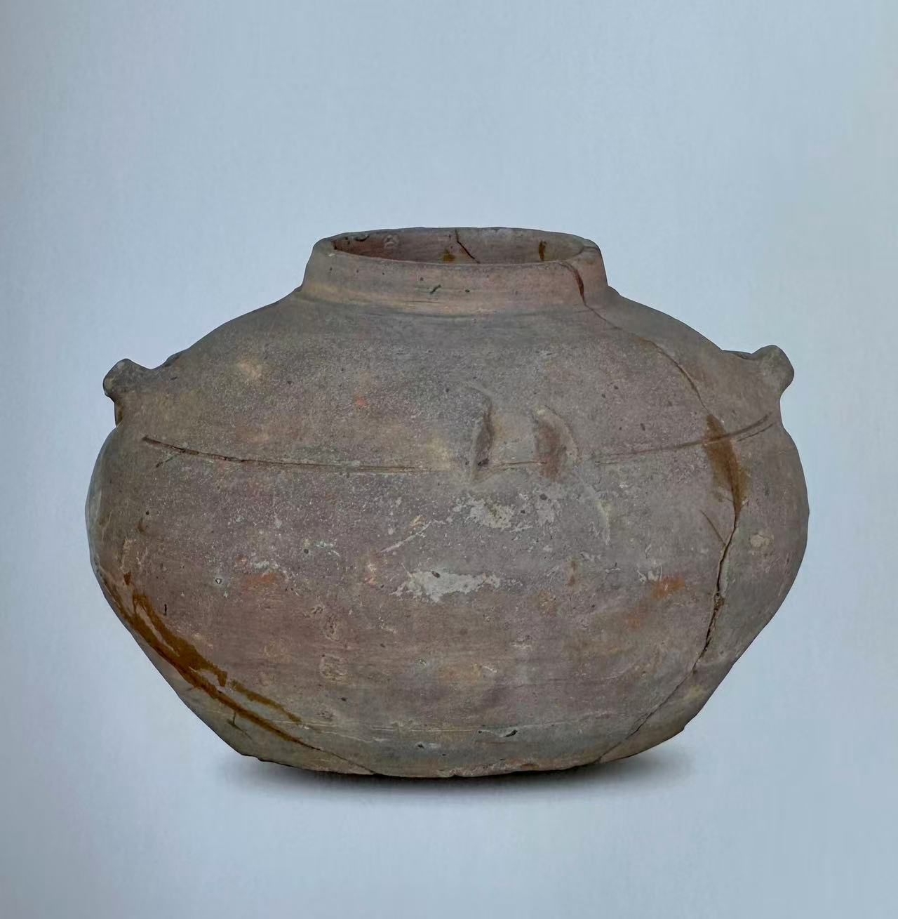 揭东区白塔宝联寨山汉墓出土。灰色泥质陶。小口近直,短颈,鼓腹,平底。肩部饰四个等距系耳,有的残损。刻一周弦纹。这是典型的汉式陶器。