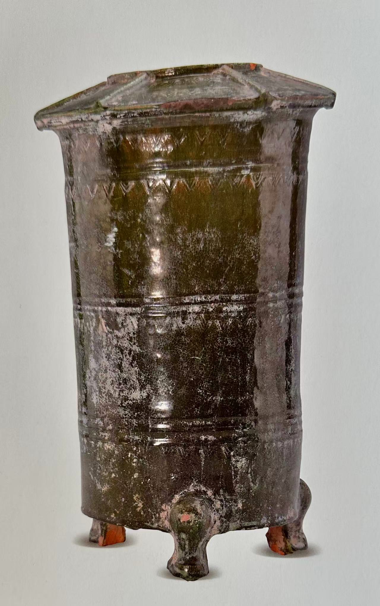 红色陶胎。直口,平沿,身为桶形,平底,近底处接三兽足。外壁四组弦纹,弦纹下压印曲折纹。仓盖斜坡形,上有六条凸棱,顶部中间有凸唇圆形口。中部有一周弦纹。弦纹上下各印一圈曲折纹。通体施铅绿釉。造型美观,和色翠绿光亮。