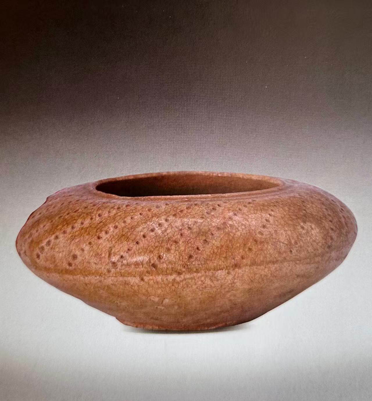 为文房用具。敛口,圆唇,扁腹,平底。器表施青釉,釉开片。肩至上腹部饰一周斜向篦点纹。造型精巧,纹饰美观,釉色晶莹亮泽。