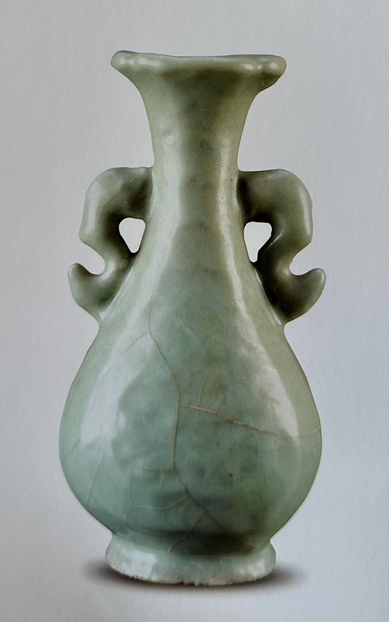 整体略扁。四瓣口外展,圆唇,细长颈,垂腹,圈足略外撇。颈、肩部贴一对大耳。通体施青釉。造型精美、釉肥厚滋润,均匀青翠。