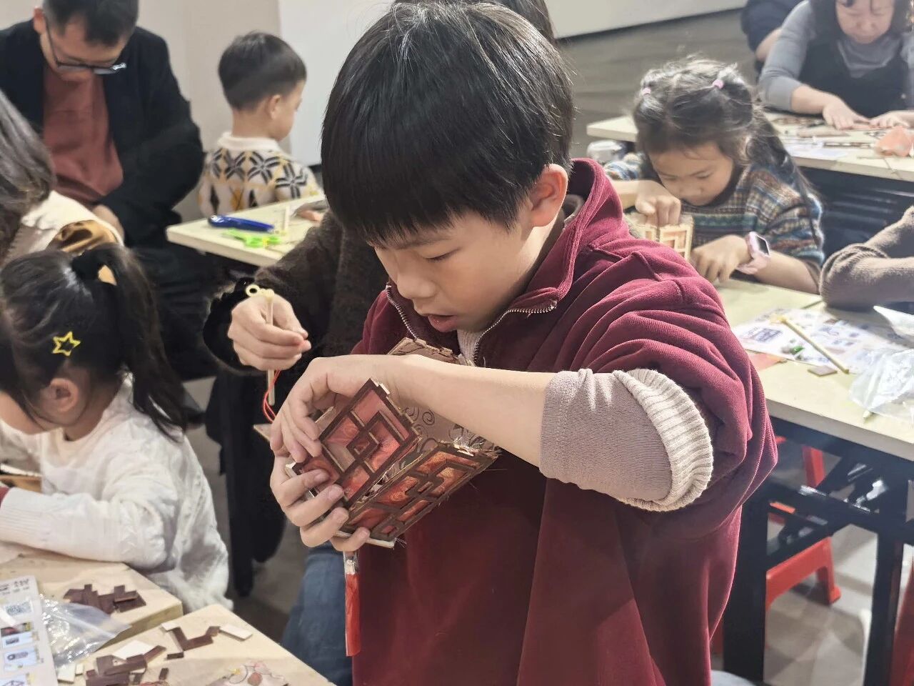 制作环节正式开启后,现场瞬间变身欢乐“手工工坊”。在社教老师的耐心讲解和示范下,大家纷纷化身小小手艺人:搭建灯架、粘贴灯面、组装配件,每一步都认真专注、乐在其中。小朋友们全神贯注,遇到问题积极举手提问;家长们耐心陪伴协助,与孩子分工合作、默契十足。大家互相分享技巧,交流节日心情,现场笑声不断、暖意融融,原本普通的材料,在一双双巧手中慢慢成型,变成一盏盏独一无二的福字灯笼。