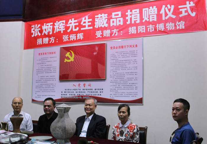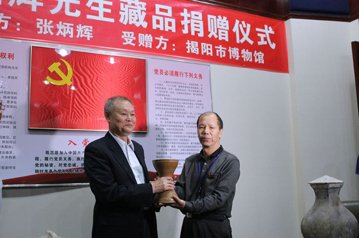 2018年11月19日,揭阳市博物馆举办接受张炳辉先生捐赠活动,张炳辉先生将自已收藏的19件/套藏品无偿捐赠给揭阳市博物馆,有陶器、瓷器、铁器、画等类别。经省专家初步鉴定,这些藏品具有较高的历史文化价值。这些藏品由我馆收藏,将进一步丰富我馆馆藏,是中国文化永久财富的一部分。